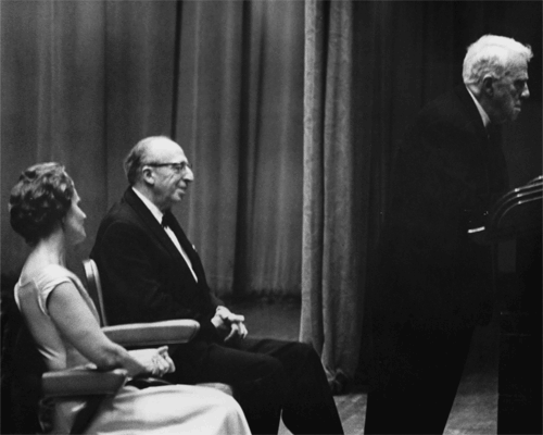 Marie Bullock and Aaron Copland watching as Robert Frost presents at the Academy of American Poets' twenty-fifth anniversary.