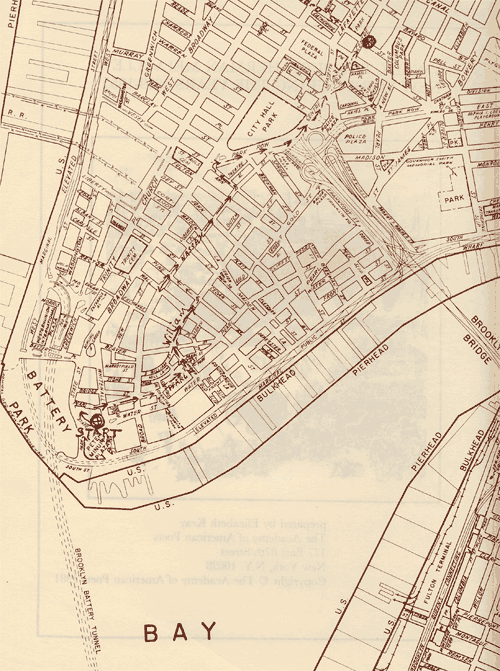 An image of the map of the walking tour of Herman Melville's New York City, prepared by former Academy of American Poets executive director Betty Kray in 1981.