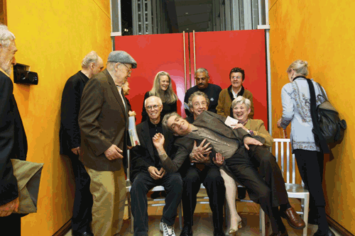 Robert Pinsky joking around with Ron Padgett, C. K. Williams, and Ellen Bryant Voigt as Chancellors Gary Snyder, Frank Bidart, Gerald Stern, Susan Stewart, Sharon Olds, Victor Hernández Cruz, Kay Ryan, and Lyn Hejinian gather during the 2008 Poets Forum.