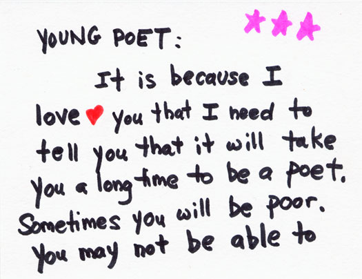 It is because I love <3 you that I need to tell you that it will take you a long time to be a poet. Sometimes you will be poor. You may not be able to afford a hamburger.