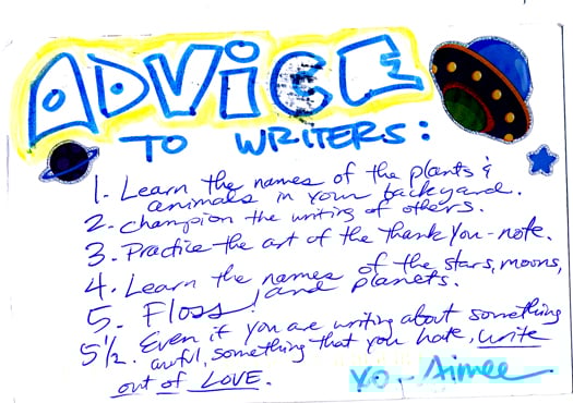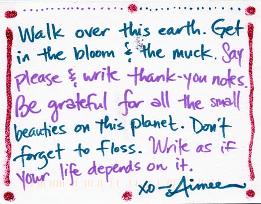 Walk over this earth. Get in the bloom & the muck. Say please & write thank-you notes. Be grateful for all the small beauties on this planet. Don't forget to floss. Write as if your life depends on it.